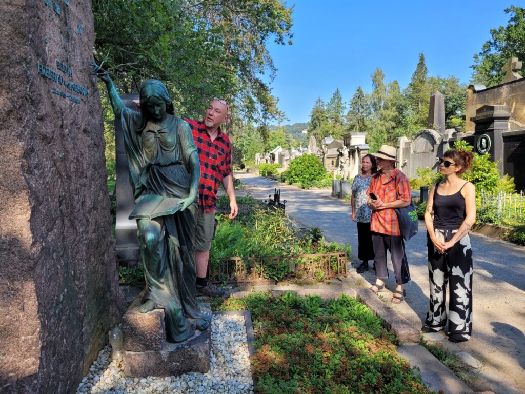 Bei dieser Führung bemerkte man mal wieder, wie interessiert die Besucher für gewisse Details sind. Die Kombination von Stein und Metall kommt an vielen Grabstätten des Johannisfriedhofs zu tragen und die Nachfragen beliefen sich oft auf die handwerklichen Techniken und man war neugierig, welche einzelnen Arbeitsschritte sich bei unseren Tätigkeiten vereinen.