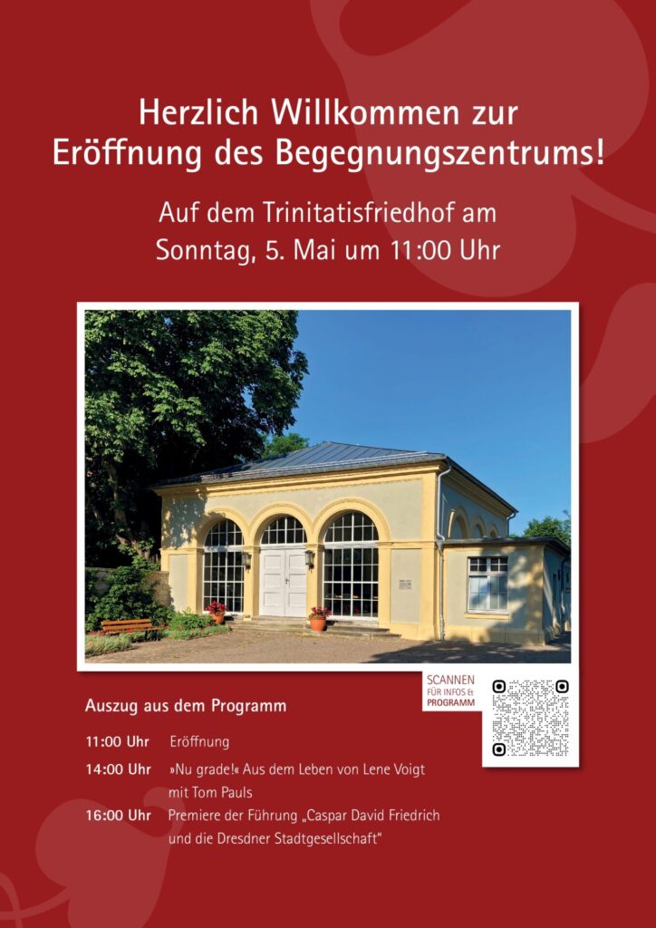 Der 5. Mai 2024 ist auch für unseren Freundeskreis ein denkwürdiges Datum. Das Begegnungszentrum auf dem Trinitatisfriedhof wurde feierlich und unter der großen Anteilnahme vieler Gäste eröffnet. Ein großer Tag, an dem auch das unbeständige und teilweise unfreundliche Wetter nichts änderte. Der Freundeskreis warb mit einem Stand seine Anliegen. Hier konnte man Buttons mit bekannten Bildmotiven Friedrichs erwerben. Ausführlich kann man sich hier informieren.