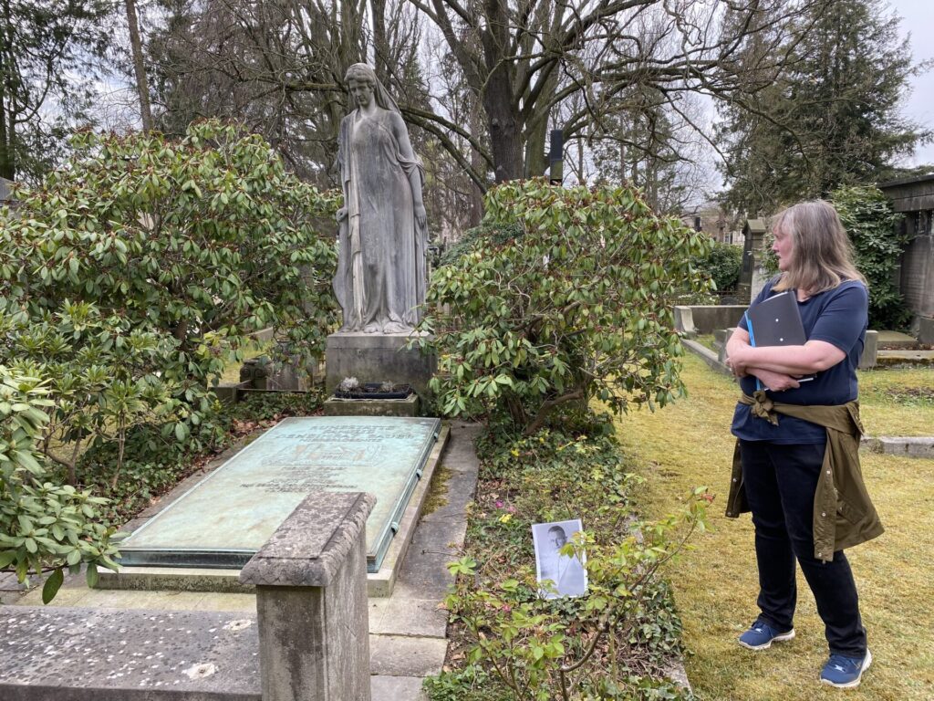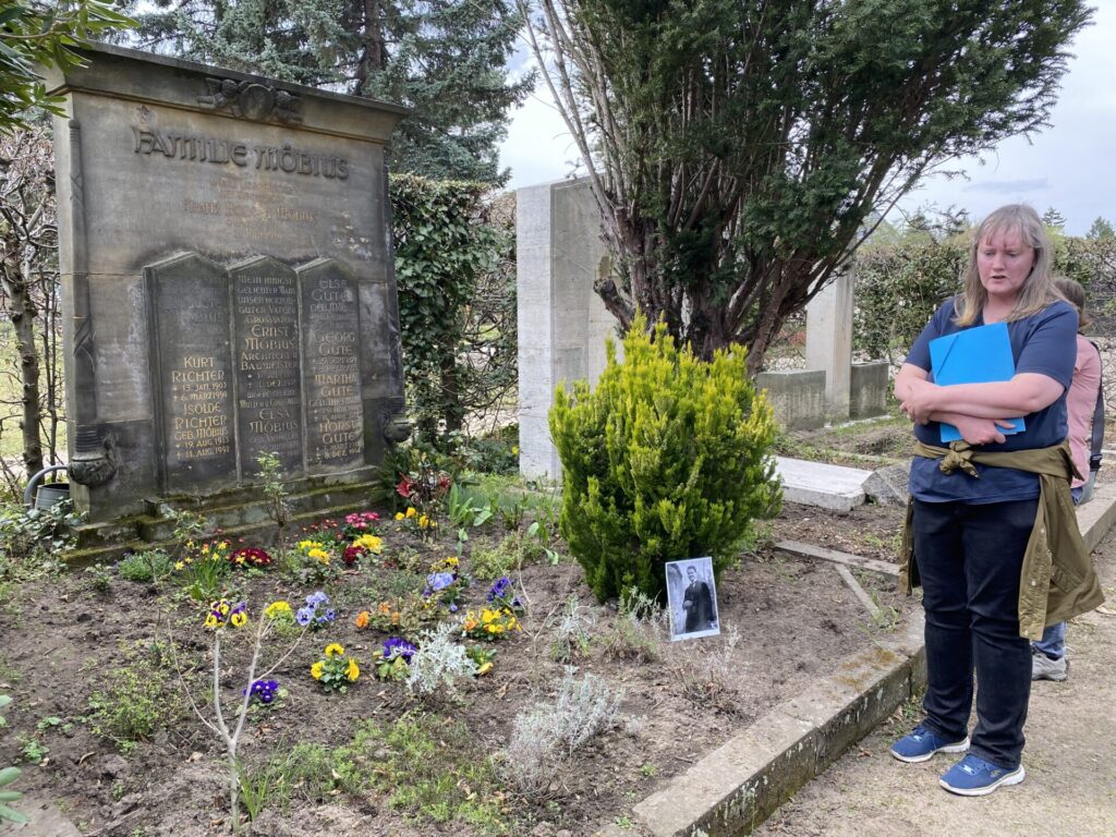 Erfreulicherweise waren trotz diverser Eisenbahnjubiläen und -feste sowie gewittriger Hitze 15 Gäste erschienen. Besonders eingegangen wurde u.a. auf das Schicksal der an ihrem 20. Geburtstag durch die Nazis im Rahmen des Euthanasieprogrammes ermordeten Helene von Gersdorff (1923-1943), der mutige Einsatz des Webereiunternehmers Curt Bauer (1880-1944) für Zwangsarbeiter und das Wirken von Bernhard Blüher (1864-1938) in Kriegszeiten. Gedacht wurde auch an den Bildhauer Werner Hempel (1904-1980) , der nach der Zerstörung Dresdens 1945 maßgeblich an der Rettung und Restaurierung steinerner Kunstwerke in der Dresdner Innenstadt beteiligt war.