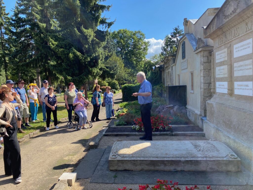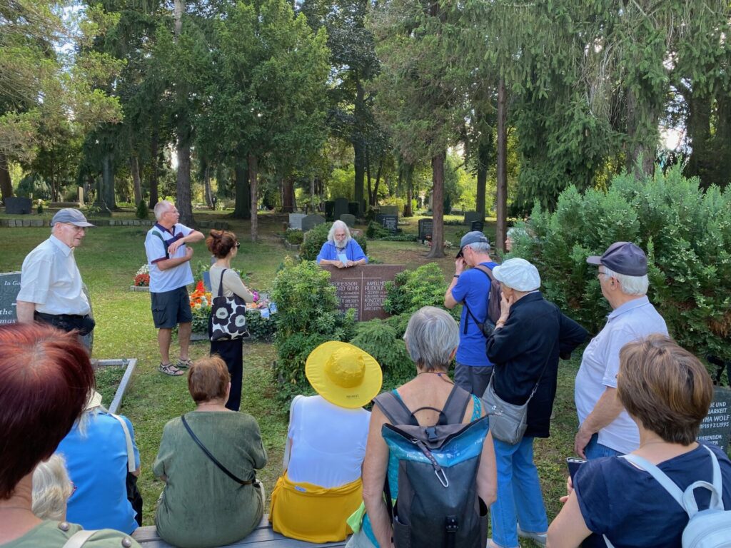 Bei prächtigem Spätsommerwetter trafen sich 25 Interessierte zur Führung über den Trinitatisfriedhof. Das Thema „zog“ und viele Fragen konnten durch uns beantwortet oder miteinander diskutiert werden. Für uns ehrenamtliche Friedhofsführer ist es immer eine Freude, wenn das Publikum aktiv mitmacht! So erfuhren auch wir Neues an der Grabstätte des Bildhauers Richard Guhr (1853-1956). Wir kamen an nahezu 20 Grabstätten vorbei, beispielswiese an der des berühmten Bildhauers Ernst Rietschel (1804-1861) und des königlichen Oberbaurates Ernst Martin Herrmann (1846-1914), über den, außer das was die Adressbücher hergeben, nichts bekannt ist, der aber in einem außergewöhnlich gestalteten Grabmal seine letzte Ruhestätte fand. Wir standen am Grab der seinerzeit sehr engagierten Dresdner Denkmalpflegerin Christine Spitzhofer (1950-2017), die sich um die Erhaltung der reichen Dresdner Friedhofskultur verdient gemacht hat und besuchten auch der Bildhauerin Clotilde Schilling (1858-1934), die ihr Grabmal selbst schuf. Den Abschluss bildete ein sponaner Wortbetrag eines Grabpaten an „seiner“ Grabstätte, die mittlerweile nahezu fertig restauriert wurde.