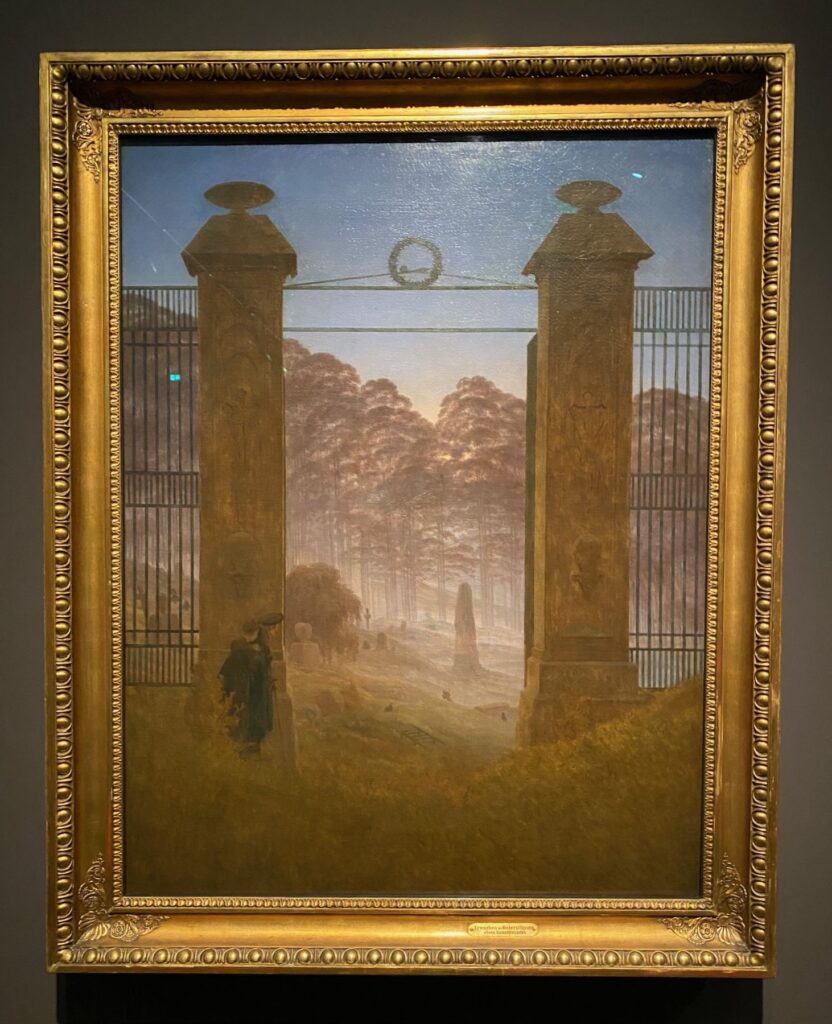 Kurator Holger Birkholz führte uns exklusiv und ging natürlich besonders auf „unser“ Bild ein: Der Friedhof. 1825 malte Friedrich dieses Bild und es ist unschwer zu erkennen, dass das Eingangstor zum Trinitatisfriedhof Friedrich zu diesem Gemälde inspirierte.